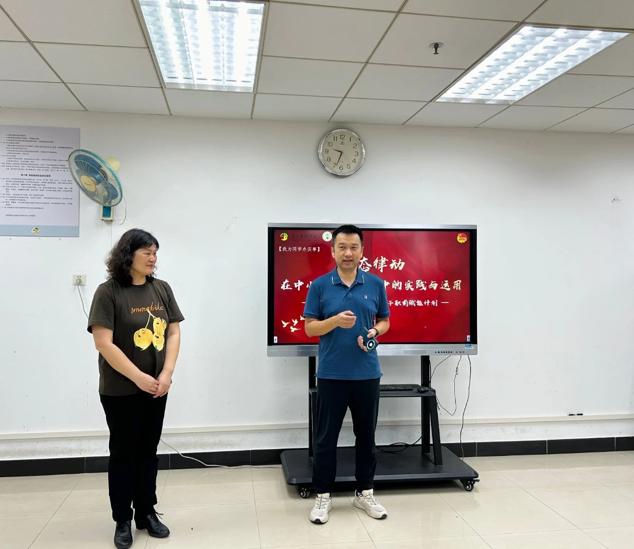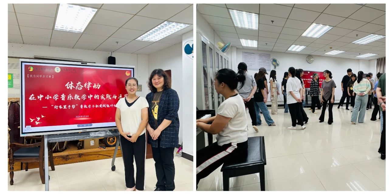 在随后的第一期培训活动中,我院优秀校友、一级教师吴梅为同学们授课,她以《体态律动在中小学音乐教学中的实践与运用》为主题,结合自身丰富的教学经验,通过生动的互动方式,将听觉、动觉与情感相结合,引导学生通过肢体律动表达音乐中的情感。课堂上,同学们积极参与,学习热情高涨,氛围活跃,收获满满。