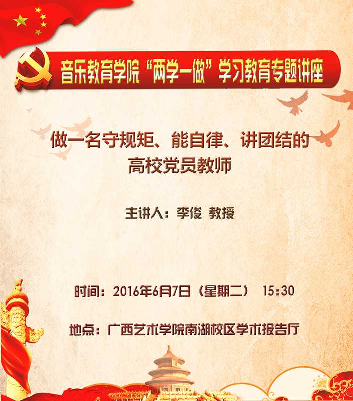 【两学一做】必威西汉姆联官网“两学一做”学习教育专题讲座 来源: 作者: 发布时间:2016-06-07 08:41:57 浏览次数: 次 【字体:小 大】 做一名守规矩、能自律、讲团结的高校党员教师 主讲人:李俊 教授 时间:2016年6月7日(星期二) 15:30 地点:广西艺术学院南湖校区学术报告厅 分享到: 【打印正文】