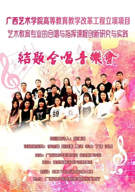 【演艺信息】广西艺术学院高等教育教学改革工程立项项目“艺术教育专业的合唱与指挥课程创新研究与实践”结题合唱音乐会 来源: 作者:必威西汉姆联官网 发布时间:2017-06-01 17:47:29 浏览次数: 次 【字体:小 大】 2017年6月1日(周四)晚20:00, 广西艺术学院高等教育教学改革工程立项项目“艺术教育专业的合唱与指挥课程创新研究与实践”结题合唱音乐会即将在相思湖校区演出厅精彩上演。欢迎广大师生到场观看指导! 合唱表演剧照 节目单 欢迎您的光临! 分享到: 【打印正文】