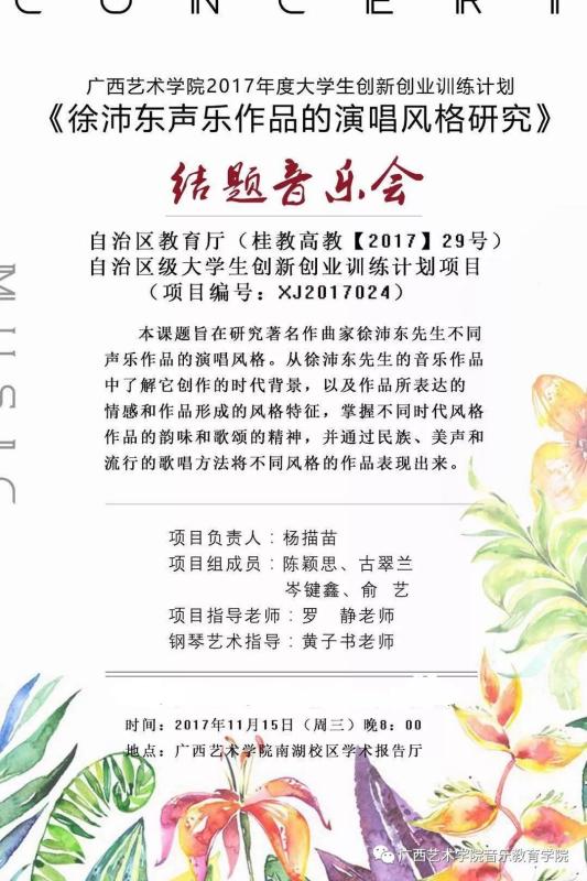 广西艺术学院2017年度大学生创新创业训练计划《徐沛东声乐作品的演唱风格研究》结题音乐会即将于11月15日(周三)晚8:00,在广西艺术学院南湖校区学术报告厅精彩上演,欢迎广大师生莅临观看!
