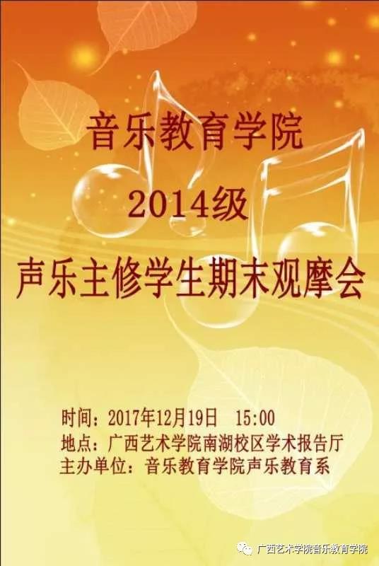 必威西汉姆联官网2014级声乐主修学生期末观摩会即将于2017年12月19日 15:00在广西艺术学院南湖校区学术报告厅精彩上演,欢迎广大师生莅临现场观看指导!