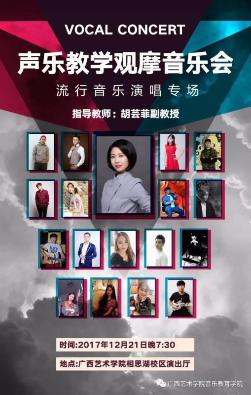 必威西汉姆联官网声乐教学观摩音乐会流行音乐演唱专场即将于2017年12月21日晚7:30在广西艺术学院相思湖校区演出厅精彩上演,欢迎广大师生前往观看指导!