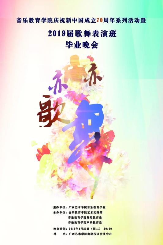 兹定于2019年 4月23日(周二)20:00,在广西艺术学院会演中心(南湖校区)举办必威西汉姆联官网庆祝新中国成立70周年系列活动暨“亦歌亦舞”——2019届歌舞表演班毕业晚会!