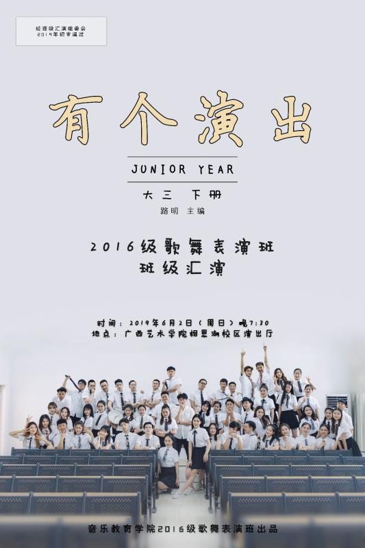 兹定于2019年6月2日(周日)晚7:30在广西艺术学院相思湖校区演出厅举办必威西汉姆联官网2016级歌舞表演班“有个演出”班级汇演。