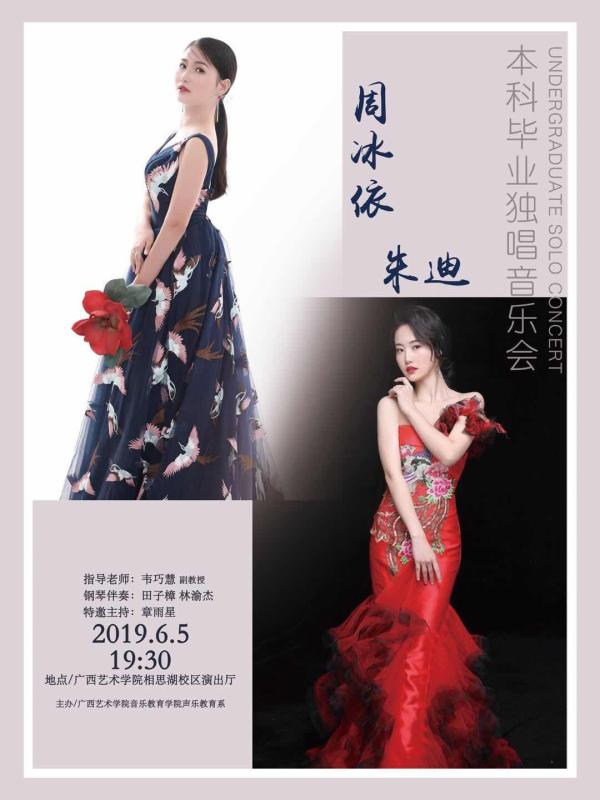 兹定于2019年6月5日(周三)晚7:30在广西艺术学院相思湖校区演出厅举办必威西汉姆联官网周冰依、朱迪本科毕业独唱音乐会。