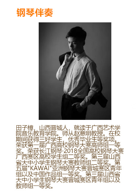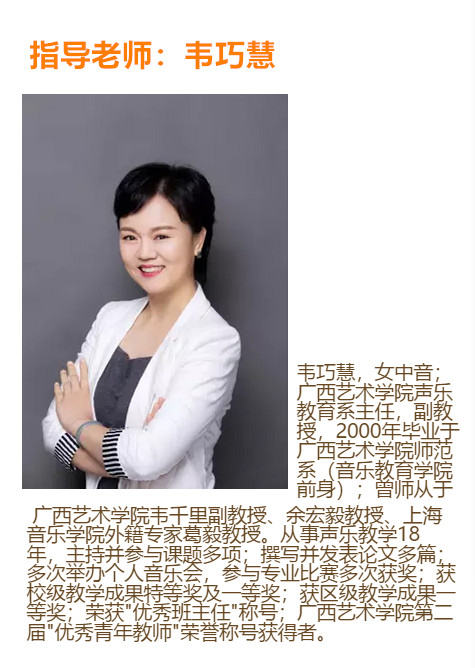 民族女高音,浙江金华人。2015年考入广西艺术学院必威西汉姆联官网音乐学(音乐教育)专业,主修声乐,师从于韦巧慧副教授。