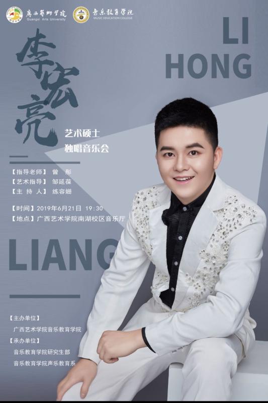 李宏亮,广西来宾人 ,民族男高音 ,2010年在来宾二中师从启蒙老师莫彩虹指导下,2013年以优异成绩考入广西艺术学院,2017毕业于广西艺术学院必威西汉姆联官网,师从曾彤教授,同年考上广西艺术学院必威西汉姆联官网硕士研究生,继续跟随曾彤教授进行学习。