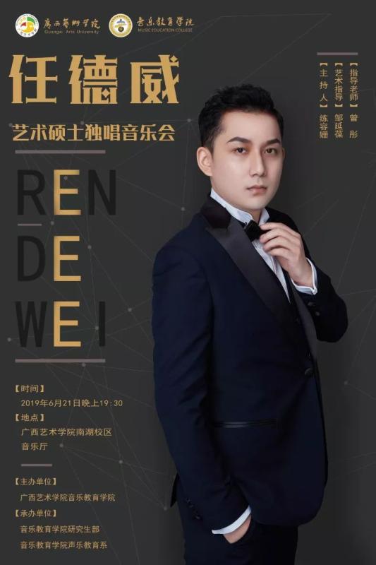 兹定于2019年6月21日(周五)19:30于广西艺术学院南湖校区音乐厅举办必威西汉姆联官网任德威艺术硕士独唱音乐会。