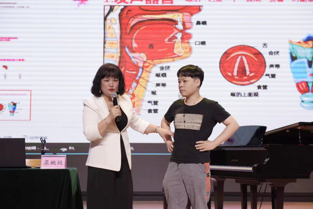 讲座上,梁姚姚教授首先从嗓音结构、呼吸器官、共鸣器官、吐字器官四大要素进行详细讲解。通过发声练习、演唱示范、技巧讲解、现场点评的方式进行教学展示,让在场学生更直观地体会和感受声乐演唱学习的全过程。
