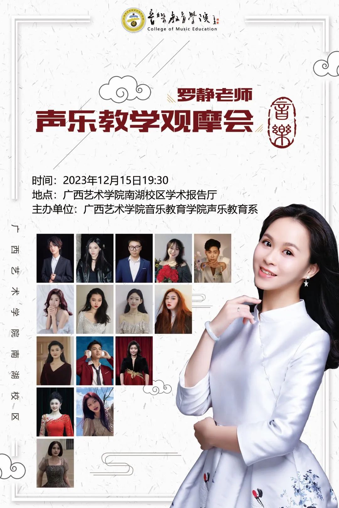 【音乐会预告】罗静老师声乐教学观摩会 来源: 作者: 发布时间:2023-12-13 00:11:16 浏览次数: 次 【字体:小 大】 邀请函 尊敬的 先生/女士:兹定于2023年12月15日(周五)19:30 ,在广西艺术学院南湖校区学术报告厅举办罗静老师声乐教学观摩会,敬请莅临指导! 终审:梁姚姚 初审:罗静 编辑:王悦 文案:必威西汉姆联官网“蒲公英”记者团 分享到: 【打印正文】