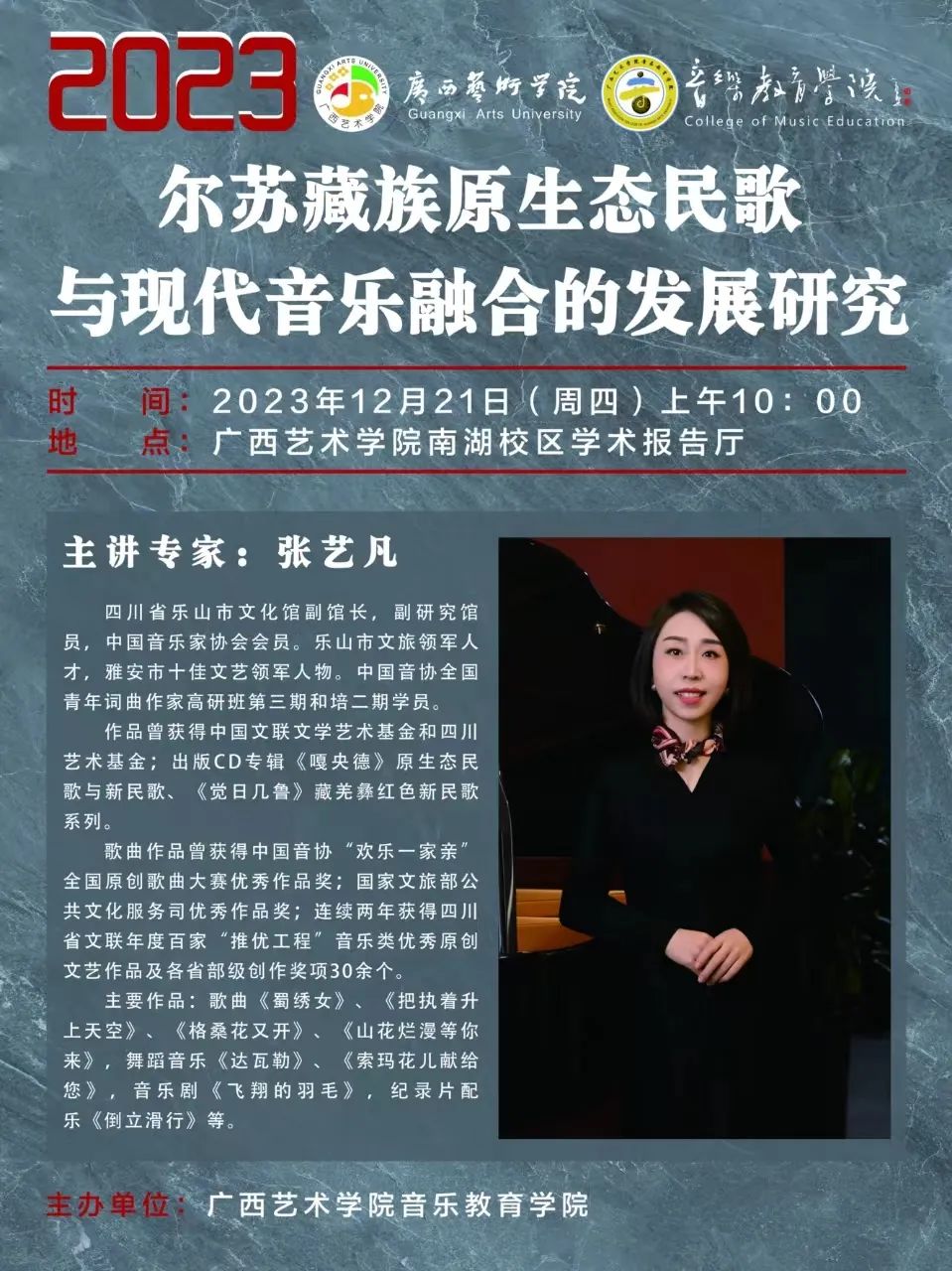 【2023学术活动预告】尔苏藏族原生态民歌与现代音乐融合的发展研究 来源: 作者: 发布时间:2023-12-20 12:40:56 浏览次数: 次 【字体:小 大】 尔苏藏族原生态民歌与现代音乐融合的发展研究主讲专家:张艺凡时间:2023年12月21日(周四)上午10:00地点:广西艺术学院南湖校区学术报告厅尔苏藏族原生态民歌展演节目单 1.觉里曼姆表演者:苏正琼、王丽梦、洛桑妮玛、王勇 2.勒思泽(洗簸箕)表演者:苏正琼、王丽梦、唐伟欣 3.萨里昂多曼表演者:姜英、洛绒、山丹梅 4.情歌表演者:洛桑妮玛、唐伟欣 5.阿瓦尕(蜜蜂报信)表演者:王丽梦、唐伟欣 6.哭嫁歌表演者:苏正琼、王丽梦 7.母亲表演者:苏正琼、唐伟欣 8.瓦曼依哇表演者:全体女同志 9.喔呀哩勒表演者:苏正琼、姜英、吴迎霞、骆平 10.劳动歌表演者:洛桑妮玛、王勇、姜英、洛绒 11.迎客歌表演者:姜英、洛绒、山丹梅新民歌展演节目单 1.环山鸡节歌(改编:陈川)表演者:洛桑妮玛、王勇 2.祈祷(改编:韩兆云)表演者:洛桑妮玛 3.格桑花又开(作词:刘柏峻 作曲:张艺凡)表演者:洛桑妮玛、王勇、洛绒 4.心手相牵(作词:刘柏峻、山丹梅 作曲:张艺凡)表演者:王丽梦、洛绒 5.阿妈的勒思泽(改编:张艺凡)表演者:王丽梦、唐伟欣、洛绒、姜英 终审:戴丽霞 初审:赵海生 编辑:窦晟元 文案:必威西汉姆联官网“蒲公英”记者团 分享到: 【打印正文】